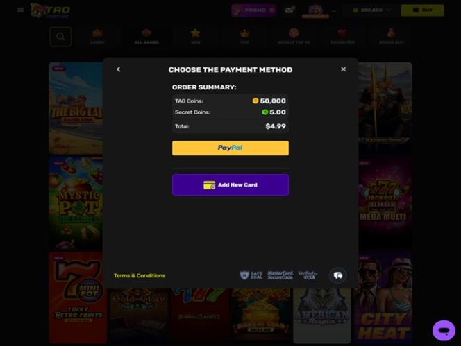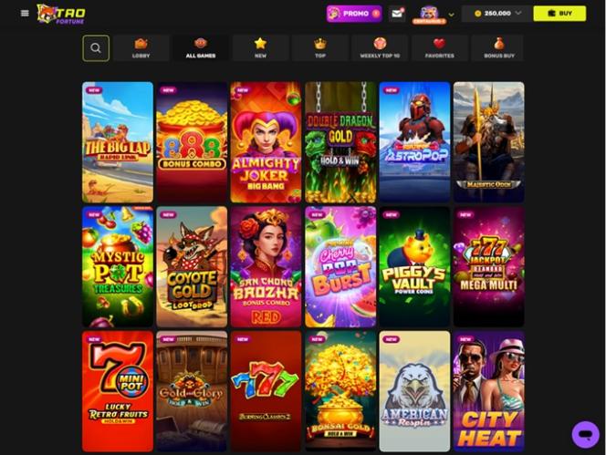 遗憾的是,TaoFortune 赌场不允许玩家体验传统的经典赌桌游戏,例如二十一点、轮盘赌、百家乐和扑克。这在意料之中,因为大多数社交赌场都专注于在线老虎机,但我们仍然希望未来能添加一些纸牌游戏。