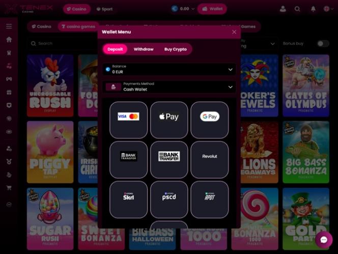 在 Tenex Casino 存款和取款非常便捷,该品牌为玩家提供了多种资金管理方式,包括Visa 、Mastercard、 Skrill 、Neteller、 Apple Pay 、 Google Pay 、Revolut 和银行电汇。该网站还接受多种加密货币,包括比特币、以太坊、莱特币、Solana、 Tron 、 Tether和Ripple 。