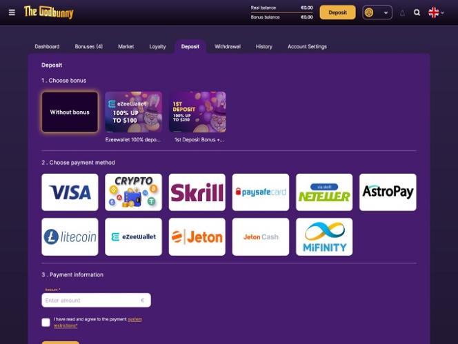 至于银行选项,Godbunny 赌场为玩家提供多种支付方式,例如 Visa、MasterCard、 Skrill、Neteller 、Paysafecard、AstroPay、Jeton 等等。运营商还允许玩家使用加密货币作为主要支付方式。