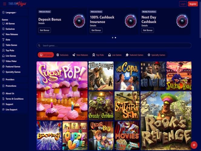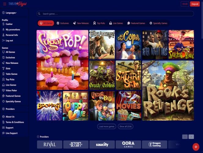 ThisIsVegas 赌场由 BetSoft, Genesis Gaming, Rival, Saucify, Arrows Edge, Radi8 Games, Fresh Deck Studios, Woohoo Games, Qora Games, Genii and Dragon Gaming提供支持,这使得赌客有机会通过可下载的软件以及让您可以通过网络浏览器玩游戏的即时播放模式来玩赌场的游戏。其他游戏