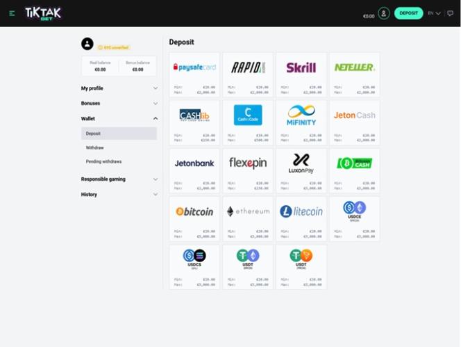 TikTak Bet 是一个极具吸引力的体育博彩网站和在线赌场,面向来自加拿大、奥地利、德国和芬兰的客户。它已获得卡纳瓦克博彩委员会 (Kahnawake Gaming Commission)的许可和注册,是您绝对值得一试的合法在线赌场之一!它给我们留下了良好的第一印象,我们即将与您分享我们的发现,敬请期待!
