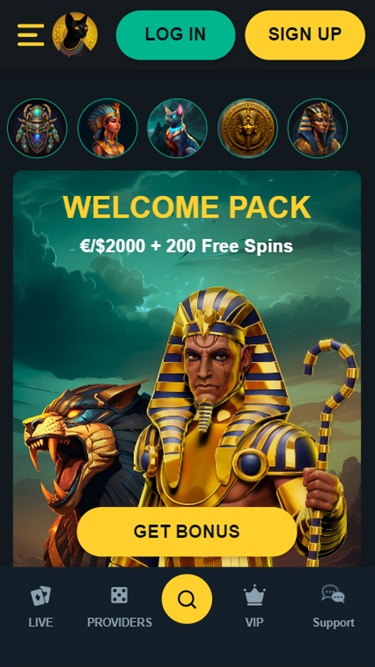 深色主题营造出愉悦的氛围,尤其引人入胜,与该品牌的视觉形象相得益彰。该品牌的视觉形象灵感源自古埃及,并充满了那个时期的标志性符号。优雅的猫咪是赌场标志的绝佳选择,而精美的法老、埃及艳后和其他有趣细节的插图,不仅吸引了喜欢此类主题的玩家,也吸引了所有欣赏精心设计的网络环境的玩家。