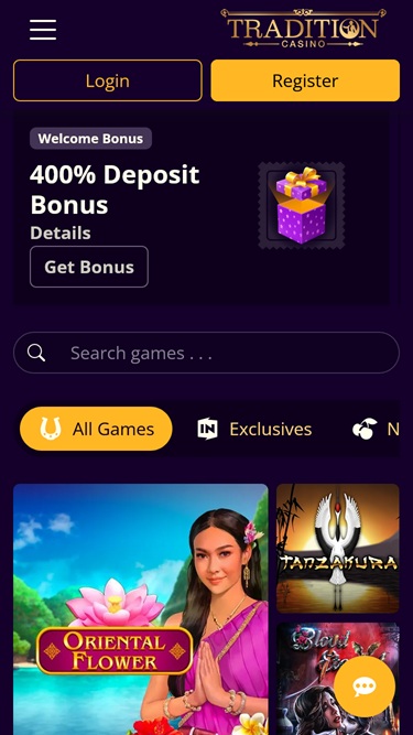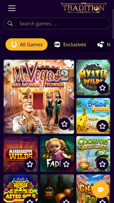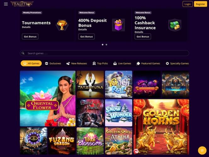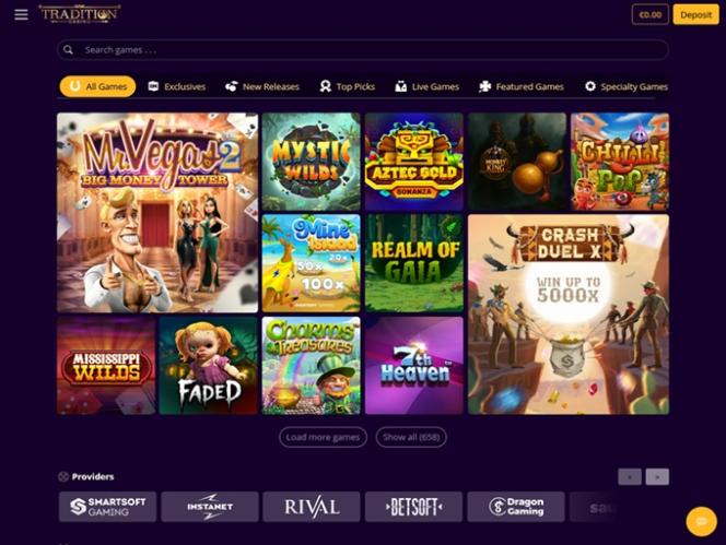 Tradition Casino 提供丰富的视频和经典老虎机游戏,包括 Rival 和 Betsoft 的游戏,主题丰富多样,功能多样,让您玩得尽兴。此外,这里还提供累积奖金,但如果您有幸中大奖,那就只能祝您好运了。