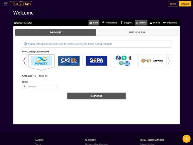 Tradition Casino 的条款和条件对玩家来说极具掠夺性,因为赌场要求所有玩家必须年满 25 岁,否则可能会扣留他们的奖金。此外,提款限额为存款金额的 10 倍,并且赌场条款中规定提款时间长达近一个月。Tradition Casino 的银行系统很差,提款时间很长,而且存款和提款方式有限,包括:eWalletXpress、ecoPayz、Neteller、Visa、MasterCard 和 Paysafecard。每月最高提款限额为 10,000 美元。