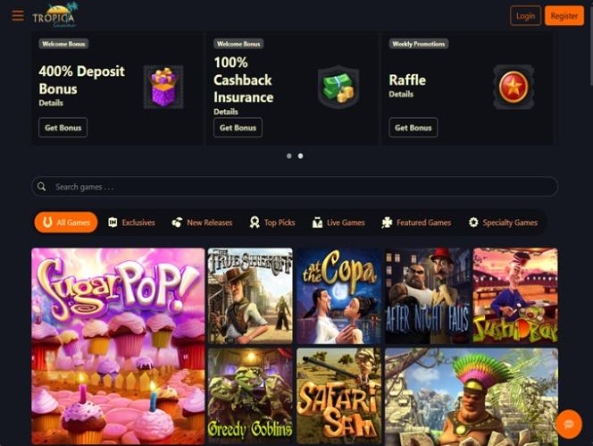 老虎机是Tropica Casino游戏库的重要组成部分,数十款老虎机游戏,只需点击按钮即可畅玩。玩家还能找到少量累积奖金,最高可达数千美元。