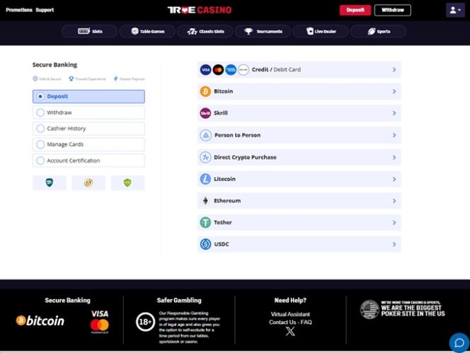 这里最酷的功能之一是可以使用比特币存款。加密货币支付越来越流行,很高兴看到 True Poker 也加入进来,让交易更快捷、更匿名。如果您不喜欢加密货币,他们仍然提供信用卡等传统支付方式,让您拥有更多选择。