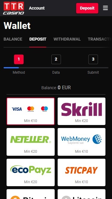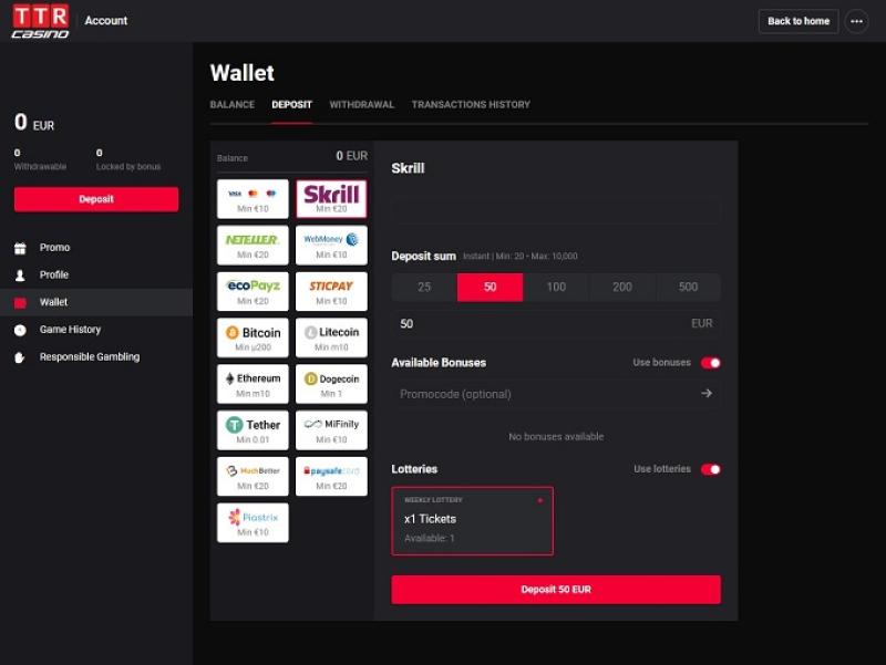 浏览了TTR赌场的条款和条件,我发现没有什么特别之处。TTR赌场的银行系统非常出色,使用比特币存款和取款几乎可以即时处理。此外,还支持SOFORT、Visa、Skrill和Neteller的存款和取款,同时还可以通过万事达卡和Paysafecard存款。取款也可以通过银行转账进行。