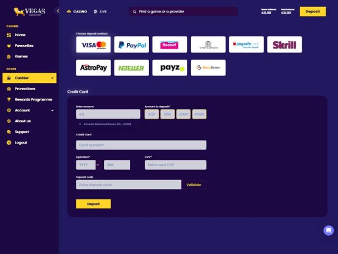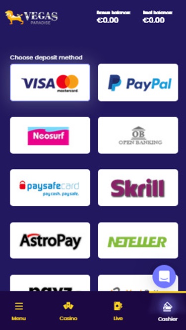 维加斯天堂的条款和条件相当标准,我找不到任何看起来对玩家不公平的地方。银行系统还不错,可以通过 Paysafecard、Maestro、Neteller、MasterCard、Visa、iDeal 和 Skrill 进行存款和取款。也可以通过支票或银行电汇提款。处理时间为 72 小时,电子钱包会在 48 小时后支付,而银行电汇和信用卡的处理时间则在 5-11 天之间。每月奖金提款限额为 3,000 英镑。
