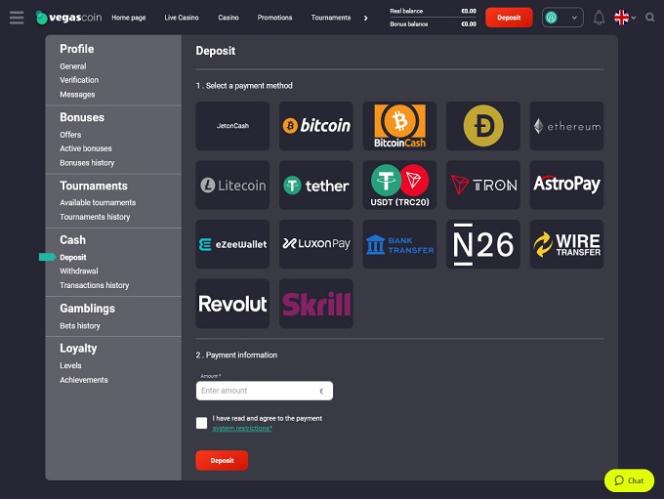 您可以通过各种加密支付选项在 VegasCoin Casino进行存款和取款,但也包括其他银行业务方法: