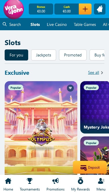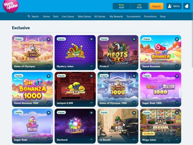 Vera John 赌场由 Amaya, Microgaming, Net Entertainment, Playtech, BetSoft, 1x2gaming, Barcrest, Big Time Gaming, ELK Studios, Evolution Gaming, EYECON, Ezugi, Genesis Gaming, Habanero Systems, iSoftBet, lightningboxgames, Oryx, Play'n GO, Quickspin, Rabcat, Relax Gaming, Thunderkick, Yggdrasil, Wazdan, Realistic Games, Booming Games, Stakelogic, Pragmatic Play, Nolimit City, Red Tiger Gaming, Booongo, Red Rake Gaming, Fantasma Games, Kalamba, Spin Games, Skywind, Triple Edge Studios, Northern Lights Gaming, Evoplay, Stormcraft Studios, Switch Studios, OneTouch, Electric Elephant Games, Triple PG, Bulletproof Games, All41 Studios, Gluck Games, Gameburger Studios, Slot Factory, Neon Valley Studios, Golden Rock Studios, Shuffle Master, SpinPlay Games, HungryBear Gaming, SmartSoft Gaming, GONG Gaming, Blue Guru Games, Buck Stakes Entertainment, Games Global, 2by2 Gaming, Ash Gaming, Bally Technologies, bluberi, Blueprint Gaming, Endemol Games, Leander Games, NextGen, Push Gaming, Tom Horn Gaming, WMS, Gaming Realms, SG Interactive, Gamomat, Red7Mobile, CORE Gaming, Scientific Games, Side City Studios, Bally Wulff, Iron Dog Studio, Foxium, Betdigital, Just For The Win, The Games Company, Reflex Gaming, Storm Gaming Technology, PearFiction Studios, Wild Streak Gaming, Slingshot Studios, Fortune Factory Studios, Jade Rabbit Gaming, STHLM Gaming, 4ThePlayer, AvatarUX, Gamevy, Crazy Tooth Studio, ReelPlay, Japan Technicals Games, Alchemy Gaming, Rarestone Gaming, Snowborn Games, Boomerang Studios, Hacksaw Gaming, Max Win Gaming, Gold Coin Studios, Bang Bang Games, Slotmill, SilverBack Gaming, Peter And Sons, Aurum Signature Studios, Lucksome Gaming, Area Vegas, RAW iGaming, Bombay Live, Leap Gaming, 3 Oaks Gaming, Wishbone Games, Spribe, Print Studios, Gaming Corps, HammerTime Games, Four Leaf Gaming, INO Games, Nailed It! Games, Atomic Slot Lab, Neko Games, Reel Kingdom, Oros Gaming, Indigo Magic, Light & Wonder and Live88提供支持,拥有庞大的游戏库,可通过网页浏览器访问,这意味着您无需下载任何繁琐的软件即可畅玩游戏。此外,我们还提供移动网站,方便喜欢随时随地畅玩的玩家。Slots