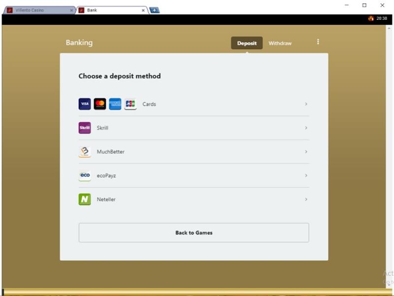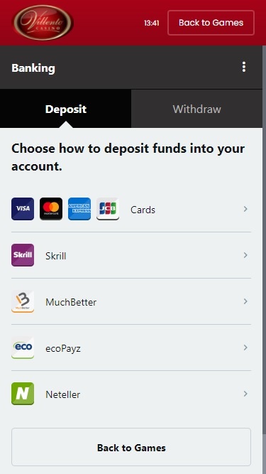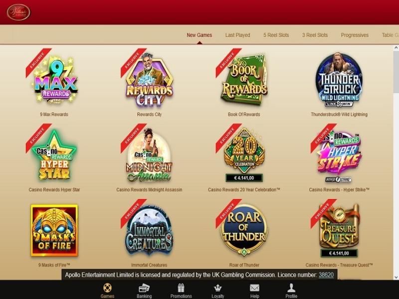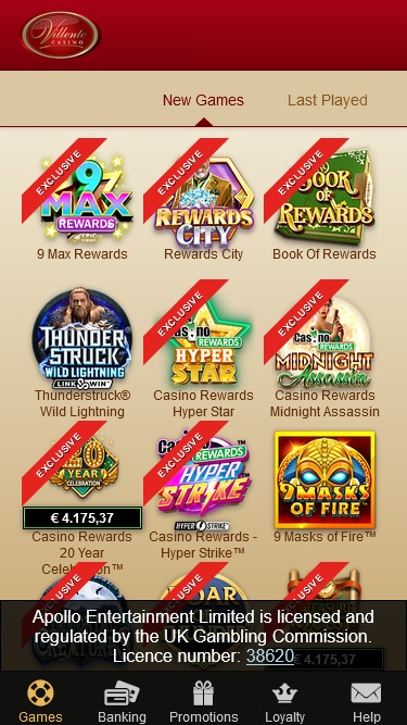 Villento 拉斯维加斯赌场由 Microgaming, Evolution Gaming, Rabcat, Triple Edge Studios, Northern Lights Gaming, Stormcraft Studios, Switch Studios, Electric Elephant Games, All41 Studios, Gameburger Studios, Pulse 8 Studios, Neon Valley Studios, SpinPlay Games, Real Dealer Studios, GONG Gaming, On Air Entertainment, Buck Stakes Entertainment, Games Global, Old Skool Studios, Foxium, Just For The Win, PearFiction Studios, Slingshot Studios, Fortune Factory Studios, Crazy Tooth Studio, Alchemy Gaming, Snowborn Games, Gold Coin Studios, Half Pixel Studios, Eurostar Studios, Aurum Signature Studios and Area Vegas提供支持,该平台提供海量游戏选择,并拥有一个优秀的平台,方便玩家访问游戏、庄家等功能。该软件可通过网页平台或可下载的客户端使用。Baccarat