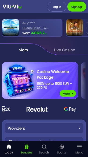 促销和奖金是Viu Viu赌场品牌的另一大卖点,也是众多荷兰和加拿大玩家争相体验的原因。首先,每个新账户都可以领取一份迎新礼包,这将大大提升每位玩家的初始体验。
