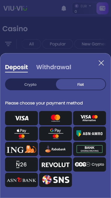 玩家可以使用多种支付方式存入和提取资金,包括Visa 、 Mastercard 、 Google Pay 、 Apple Pay 、银行电汇和Revolut 。赌场还接受比特币、比特币现金、卡尔达诺、狗狗币、莱特币、以太坊、 Toncoin 、 Tron 、 Tether 、瑞波币和USD Coin等加密货币。