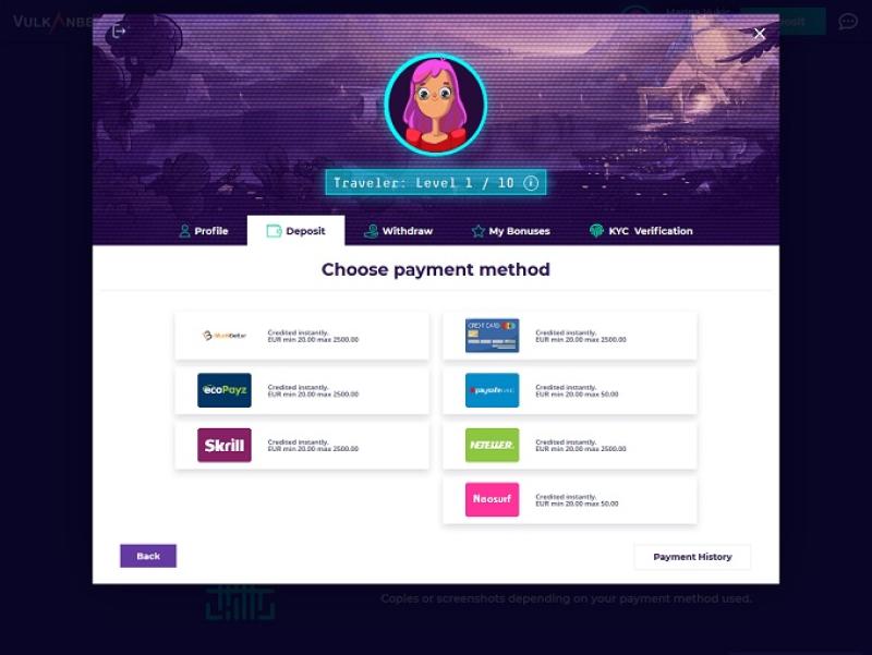 Vulkanbet 的银行系统相当不错,但支付需要 48 小时才能到账。您可以使用银行卡和电子钱包来处理存款和取款。