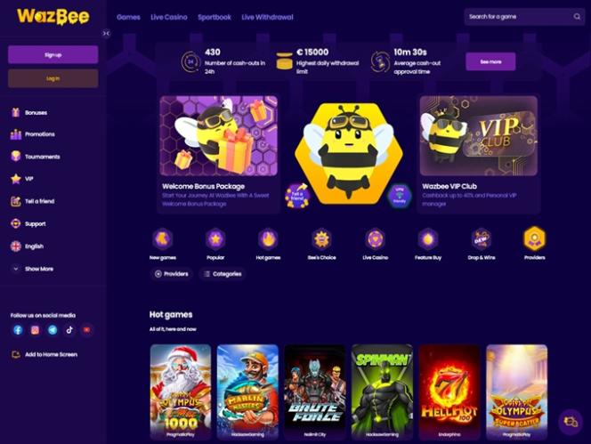 Wazbee Casino 于 2023 年上线,打造了一个庞大的博彩网站,提供丰富的体育博彩和游戏选择,涵盖在线老虎机、真人荷官、速成游戏和桌面游戏,几乎可以满足所有类型的玩家。凭借其出色的促销计划、极快的提现速度以及创新的“实时提现”功能,我们毫不奇怪为什么这么多玩家选择这个品牌!