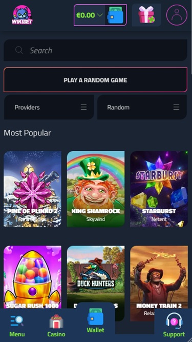 WikiBet 有两个主要类别:体育博彩和赌场。在赌场部分,您可以找到老虎机、真人游戏、街机游戏和宾果游戏;而体育博彩部分则涵盖热门体育联赛和运动项目,例如足球、电子竞技、网球、篮球、棒球、排球以及其他热门项目。如果您是体育博彩的爱好者,千万不要错过这些诱人的体育博彩机会。然而,由于我们更专注于赌场游戏,因此我们将更深入地回顾一下可用的赌场内容。