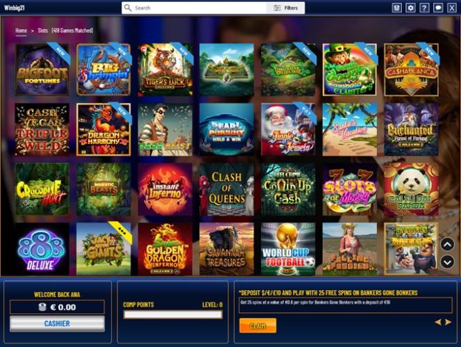 Winbig 21 赌场由 BetSoft, Genesis Gaming, Rival, Saucify, Arrows Edge, Radi8 Games, Fresh Deck Studios, Woohoo Games, Qora Games, Genii, Dragon Gaming and Dragoon Soft提供支持,其游戏和奖金通过基于网页的即时游戏平台和可下载的软件提供。赌场还支持移动游戏,让您随时随地畅玩。