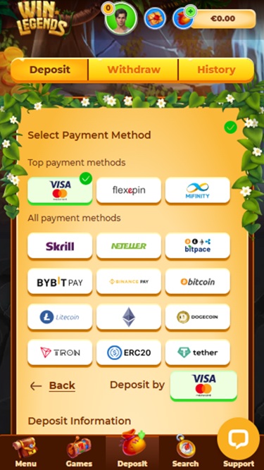 Banking银⾏业务选项 的 WinLegends Casino