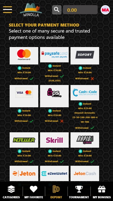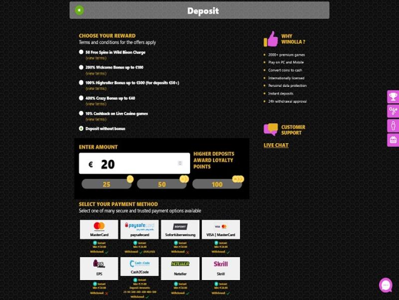 至于支付方式,Winolla Casino 为玩家提供使用知名选项进行存款的机会,例如 Visa、MasterCard、Paysafecard、Neteller、Trustly、Astropay 和Skrill等。