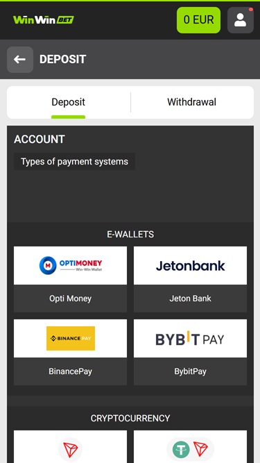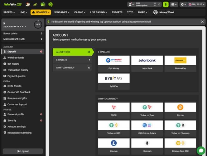 Banking银⾏业务选项 的 WinWin.Bet Casino