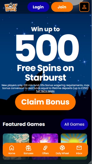 Wolf Spins 是一家在线赌场,致力于为玩家提供精彩的游戏库,其中包含数千款独特的游戏,包括在线老虎机、桌面游戏、真人荷官、宾果游戏和刮刮卡。凭借丰富的娱乐选择和海量促销和奖金,难怪如此多的玩家蜂拥而至。