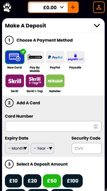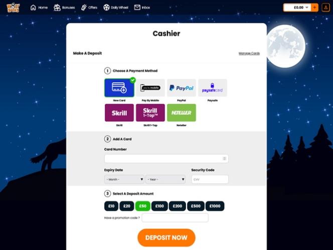 关于支付方式,Wolf Spins 赌场接受多种传统支付方式,包括Visa 、 Mastercard 、 Maestro 、 Paypal 、 Paysafecard 、 Skrill和Neteller 。遗憾的是,在撰写本文时,该品牌尚不接受加密货币。