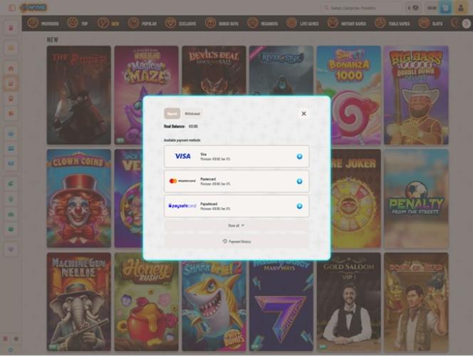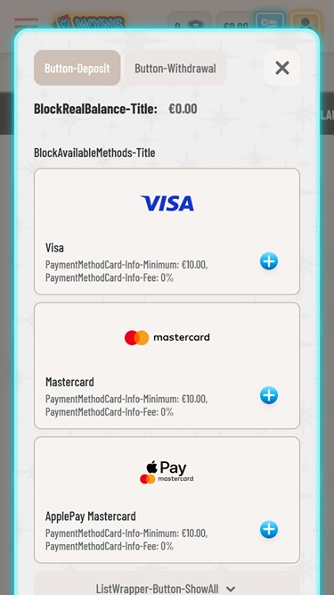 Wyns 赌场提供各种支付方式,例如 MiFinity、银行电汇、Neosurf、Nordea、Skrill、Netteler、Visa 和 MasterCard 等等,以及许多加密货币选项,例如比特币、比特币现金、卡尔达诺、狗狗币、以太坊、莱特币、瑞波币、Tether 和 USD Coin。