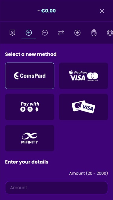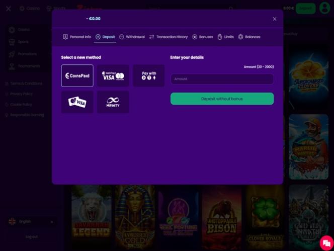 赌场出纳员支持多种银行业务方式。玩家可以使用多种直接银行转账方式、可靠且流行的电子钱包以及信用卡和借记卡。