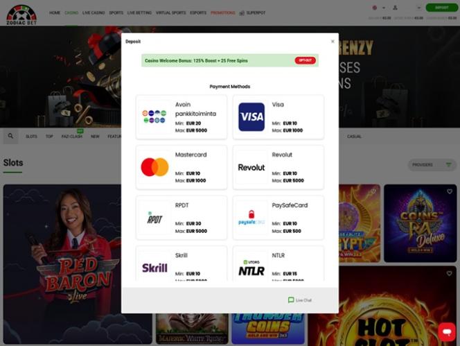 ZodiacBet 赌场由 Microgaming, Net Entertainment, Playtech, BetSoft, 1x2gaming, Amatic Industries, Big Time Gaming, ELK Studios, Evolution Gaming, EYECON, Ezugi, Genesis Gaming, Habanero Systems, lightningboxgames, Oryx, Play'n GO, Quickspin, Rabcat, Relax Gaming, Thunderkick, Vivo Gaming, Yggdrasil, Endorphina, Wazdan, GameArt, Betgames, Booming Games, Stakelogic, Pragmatic Play, Nolimit City, Red Tiger Gaming, Booongo, LuckyStreak, Spinomenal, Felix Gaming, Inbet Games, Skillzzgaming, Xprogaming, Fugaso, Fantasma Games, Kalamba, Spin Games, Skywind, Triple Edge Studios, BGAMING, Northern Lights Gaming, Fazi, Evoplay, Stormcraft Studios, Switch Studios, OneTouch, Pocket Games Soft, Bulletproof Games, All41 Studios, Gluck Games, Mascot Gaming, TVBet, Gameburger Studios, Pulse 8 Studios, Neon Valley Studios, Golden Rock Studios, Swintt, SpinPlay Games, SmartSoft Gaming, Real Dealer Studios, GONG Gaming, Blue Guru Games, Buck Stakes Entertainment, Elysium Studios, Eurasian Gaming, Games Global, 2by2 Gaming, bluberi, Blueprint Gaming, GamesOS, Merkur Gaming, Push Gaming, Tom Horn Gaming, Gamomat, Reel Time Gaming, BF Games, Bally Wulff, Iron Dog Studio, Old Skool Studios, Foxium, Just For The Win, Reflex Gaming, Storm Gaming Technology, PearFiction Studios, Wild Streak Gaming, Slingshot Studios, Golden Hero, Fortune Factory Studios, RubyPlay, 4ThePlayer, AvatarUX, Gamevy, Crazy Tooth Studio, ReelPlay, Japan Technicals Games, SlotVision, Alchemy Gaming, Plank Gaming, BB Games, Black Pudding Games, Snowborn Games, Boomerang Studios, Hacksaw Gaming, Max Win Gaming, Gold Coin Studios, Bang Bang Games, Gamzix, Half Pixel Studios, Arcadem, Peter And Sons, Eurostar Studios, Aurum Signature Studios, Lucksome Gaming, Area Vegas, Leap Gaming, Kiron, Amigo Gaming, Wishbone Games, Spribe, Circular Arrow, Print Studios, HammerTime Games, INO Games, Nailed It! Games, Atomic Slot Lab and PlayAce提供支持,游戏通过网页即时游戏平台提供。网站界面美观,易于浏览,注册账户几分钟即可开始游戏。网站支持移动端游戏,您可以根据需要在智能手机或平板电脑上畅玩。Baccarat