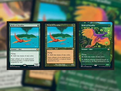 人们还提到了即将推出的《多明纳里亚重制版》;他们将重新印制带有复古边框的《天堂鸟》(《万智牌无限》,1993 年 12 月)的原始艺术作品,它基本上看起来很像他们刚刚推出的《万智牌 30 周年纪念版》,但带有真正的《万智牌:聚会》背面,而不是特殊的《万智牌 30 周年纪念版》背面。