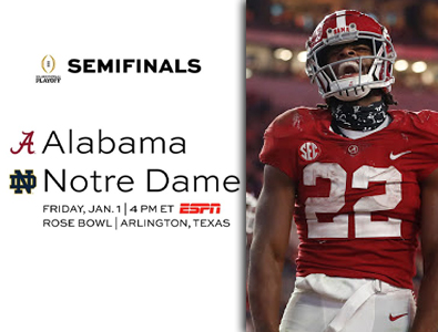 2020年NCAA大学橄榄球季后赛半决赛将于元旦开赛,届时排名第一的阿拉巴马大学红潮队将在玫瑰碗比赛中对阵排名第四的圣母大学爱尔兰战士队。这场比赛的胜者将晋级NCAA大学橄榄球季后赛全国冠军赛,并将于2021年1月11日星期一在迈阿密迎战另一场CFP半决赛的胜者——俄亥俄州立大学七叶树队和克莱姆森大学老虎队。