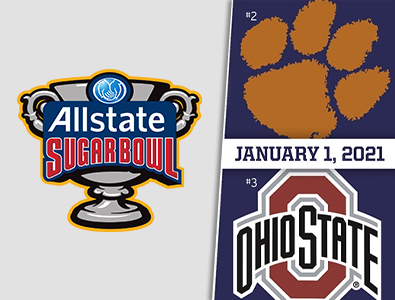 2020-2021赛季大学橄榄球季后赛半决赛糖碗赛由Allstate保险公司呈现。这场备受期待的橄榄球大战将于2021年1月1日星期五美国东部时间晚上8:00举行。这场克莱姆森大学老虎队(排名第2)和俄亥俄州立大学七叶树队(排名第3)之间的比赛将在位于路易斯安那州新奥尔良的梅赛德斯-奔驰超级穹顶体育场举行,这里也是NFL新奥尔良圣徒队的主场。ESPN将进行全国直播,您也可以通过ESPN App观看比赛。