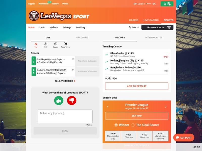 LeoVegas Sport 是首批在 Kambi 体育博彩平台上运营的运营商之一,该平台拥有前端用户界面、赔率汇编和客户情报。