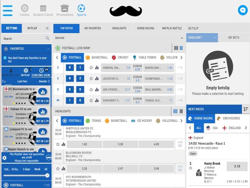 这家全新且激动人心的在线游戏提供商、赌场和体育博彩公司致力于吸引全球体育博彩玩家。该品牌由Marketplay LTD拥有和运营,该公司受马耳他法律和法规的管辖和监管。本网站上的博彩选项由Aspire Global International LTD提供支持和管理。Mr. Play的体育博彩页面简洁明了,易于浏览,并配备了顶级体育博彩平台应有的所有功能。