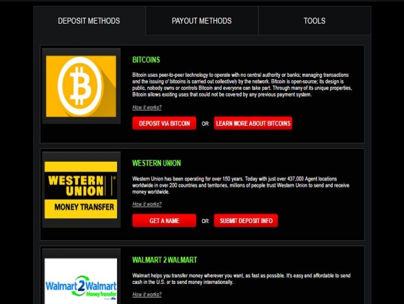 提款方式:Visa、万事达卡、Discover、美国运通卡、比特币、比特币现金、以太坊、达世币、卡尔达诺、预付礼品卡、沃尔玛至沃尔玛、西联汇款、速汇金、银行间转账、现金银行存款、汇票、Pay Pal 至 Pay Pal、Zelle Pay、莱特币、瑞波币、恒星币和美元币。