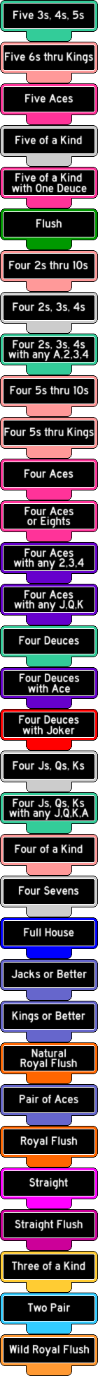 它也被称为双倍累积奖金 (Double Jackpot),是另一种赔率更高的扑克游戏变体,尤其适用于四条牌,尤其是 A 和任意人头牌。如果您喜欢玩它的小兄弟 A 和人头牌,那么双倍A 和人头牌扑克 (Double A 和人头牌扑克)可能也会觉得它很有趣,只不过赔率更成熟一些!