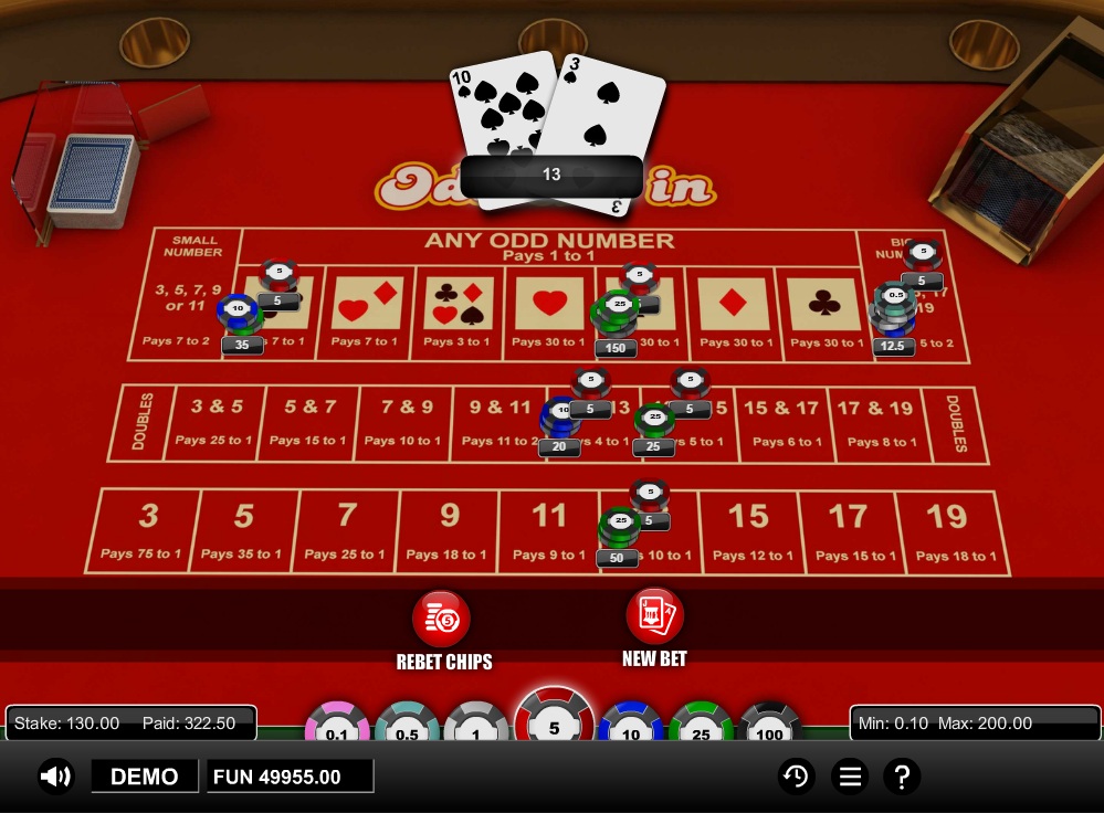 - 大小注:此类投注遵循常规规则,总点数低于或高于10.5时赔率为1赔1,但如果出现三张同点,则双方均输。庄家优势为2.78%。