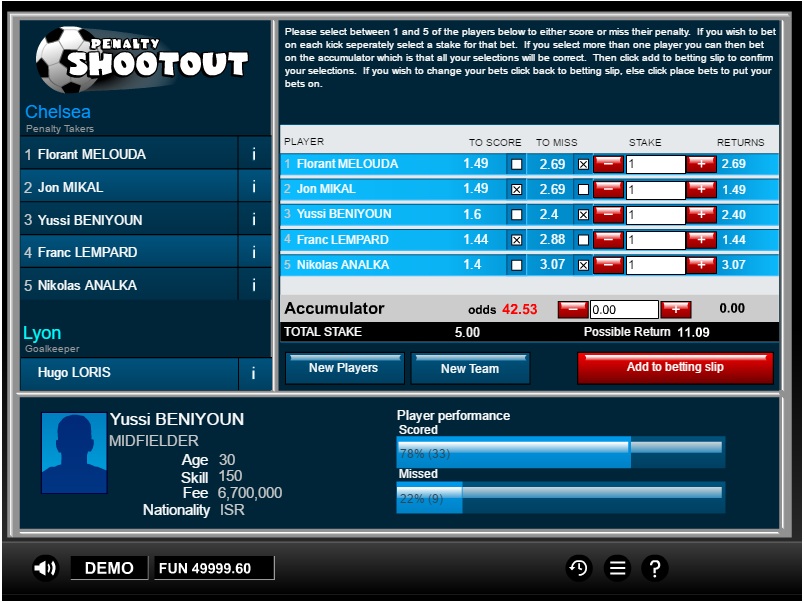 这是另一个简单的1X2概率游戏。玩家押注五名球员在足球比赛中是否会罚进点球。假设两种情况下的赌场优势相同,我估计赌场优势约为96%。