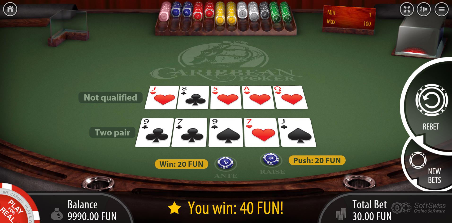 SOFTSWISS 遵循德州扑克奖金的自由拉斯维加斯规则,其中 Ante 支付顺子或更好的牌,赌场优势为 2.04%。