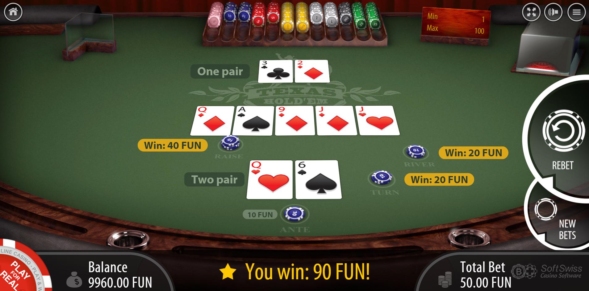 SOFTSWISS 的Casino Hold 'Em游戏遵循通常的 1-2-3-10-20-100 Ante 赔付表,赌场优势为 2.16%。
