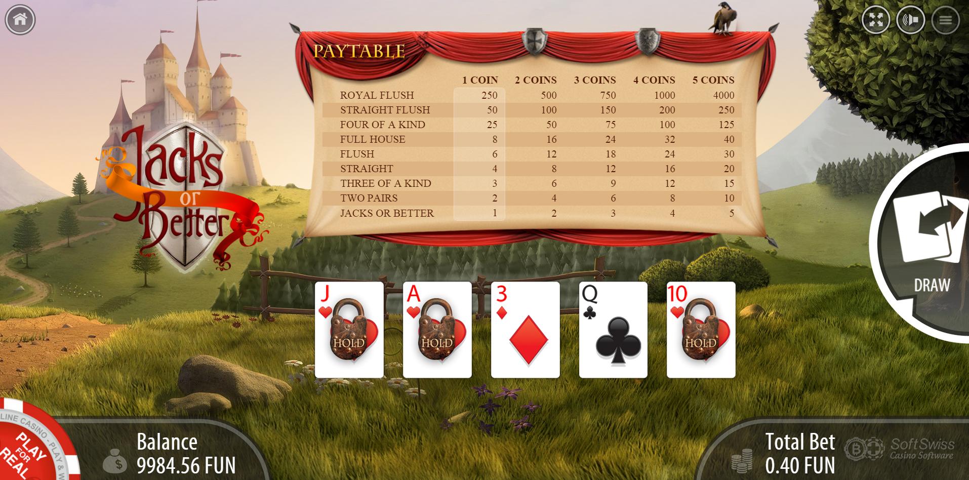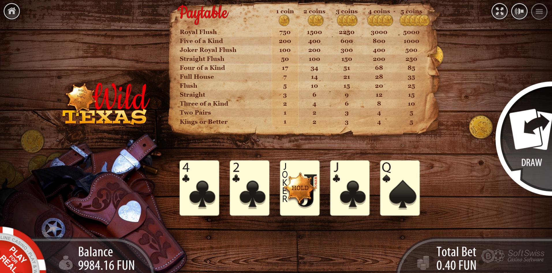 视频扑克游戏只有两款:Jacks or Better 和 Joker Poker。Joker Poker 又名 Japan Dream 和 Wild Texas。在撰写这篇评测时,我还没能运行 Japan Dream,但能看到它的赔率表,和 Wild Texas 的赔率表一样。