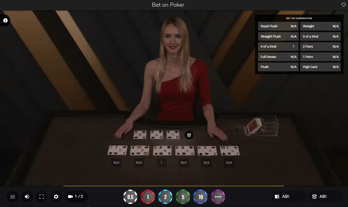 Atmosfera 是少数提供扑克投注服务的供应商之一。扑克投注是一款由真人荷官进行四到九手德州扑克游戏。玩家的目标是押注哪个位置会获胜以及获胜的牌型是什么。