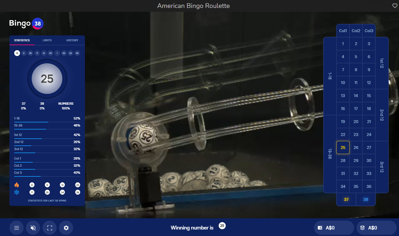 - 美式宾果轮盘赌——玩法是从38个自动球斗中抽取一个球。赌场优势为5.26%。