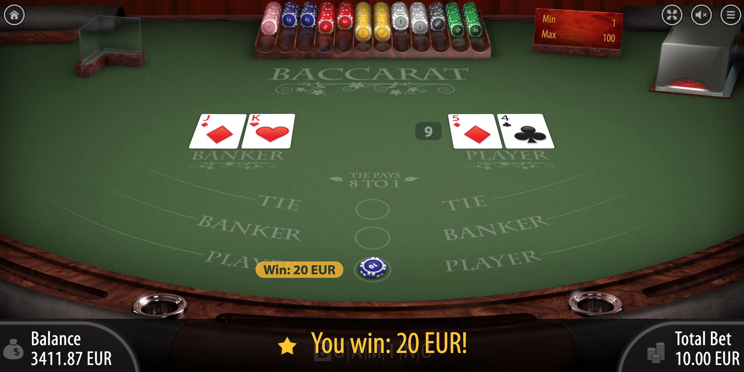 百家乐游戏相当标准。只有三种主要赌注:庄家、闲家和和。和局的赔率很低,只有8比1。