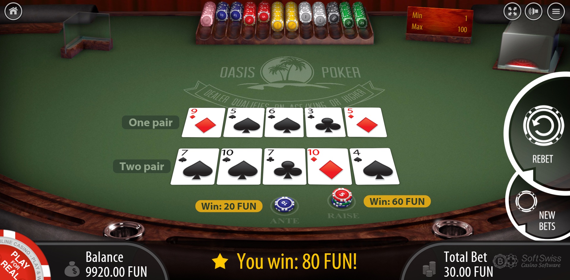 如果你没听说过绿洲扑克 (Oasis Poker) ,它类似于加勒比梭哈扑克,但增加了用底注 (Ante) 换牌的选项。赔率表通常为 1、2、3、4、5、7、20、50、100。采用最佳策略(包括切换)时,赌场优势为 1.04%。