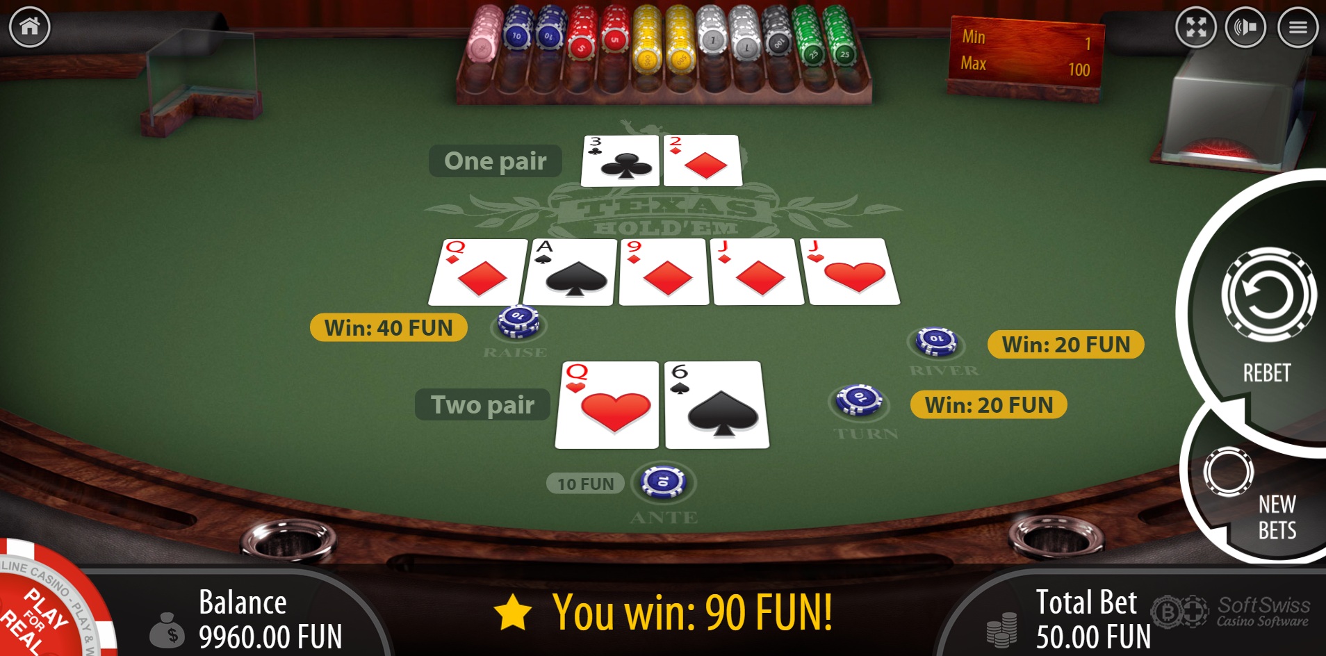 BGAMING 遵循拉斯维加斯的宽松德州扑克奖金规则,即顺子或更好的牌支付底注,赌场优势为 2.04%。游戏帮助文件显示回报率为 98.75%,我对此没有异议。我猜他们衡量的是预期回报率与总投注金额的比率。