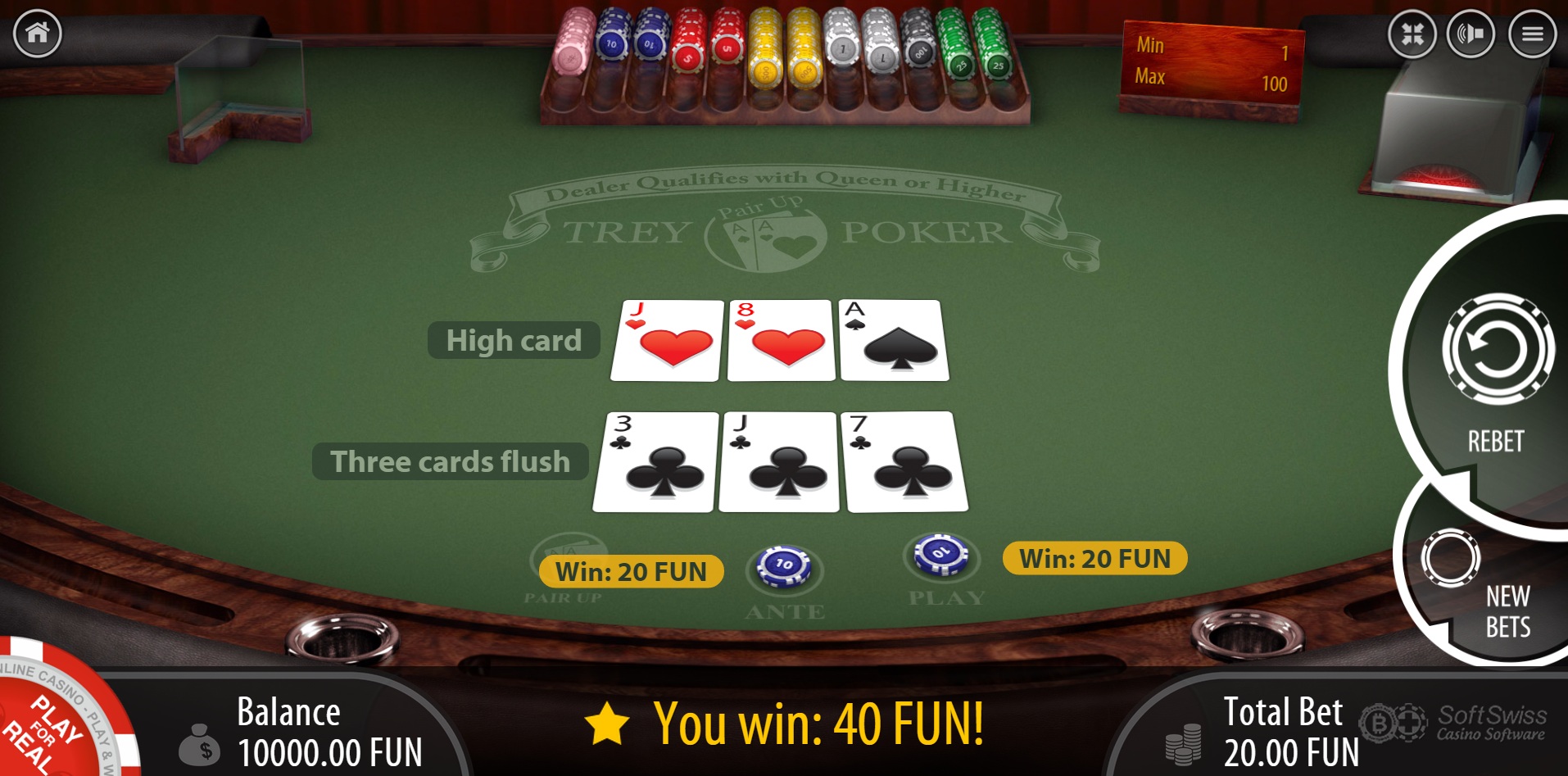 BGaming 将他们的三张牌扑克游戏命名为 Trey Poker。Ante Bonus 遵循通常的 1-4-5 赔率表,赌场优势为 3.37%。通常被称为 Pair-Plus 的赌注,他们称之为 Pair Up 赌注,其赔率表为 1-3-6-30-40-100(包括 mini royal 的赔率 100),赌场优势为 5.10%。