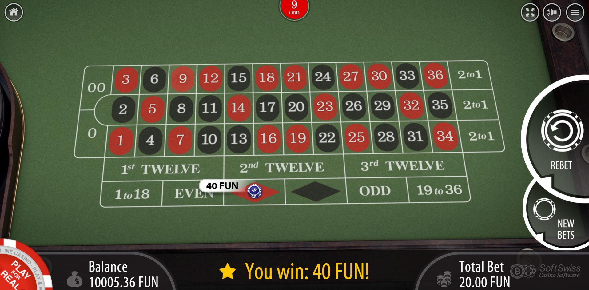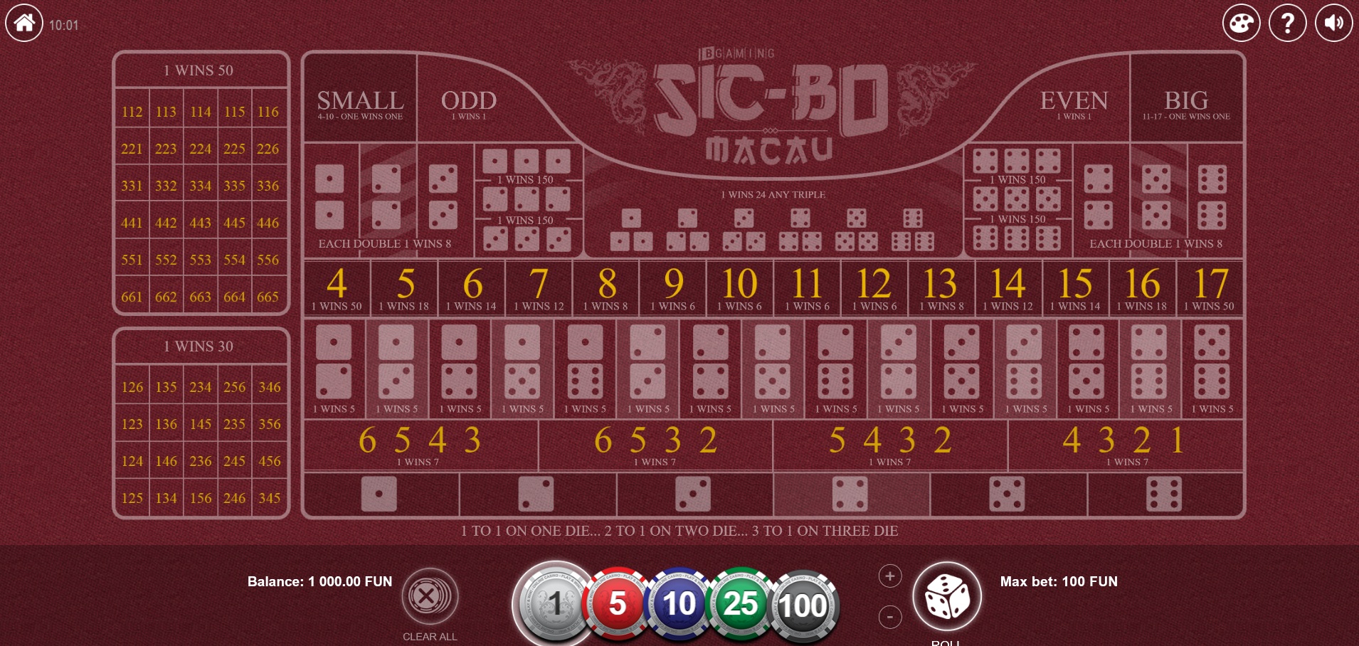 - 精确掷骰(三个单数)——类似于掷骰子中的简单跳注,只不过用的是三个骰子。玩家选择由三个单数组成的特定骰子点数。例如,2-4-6。玩家必须掷出恰好 2-4-6 才能获胜。游戏提供六种骰子面中三个骰子面的所有 20 种可能组合。