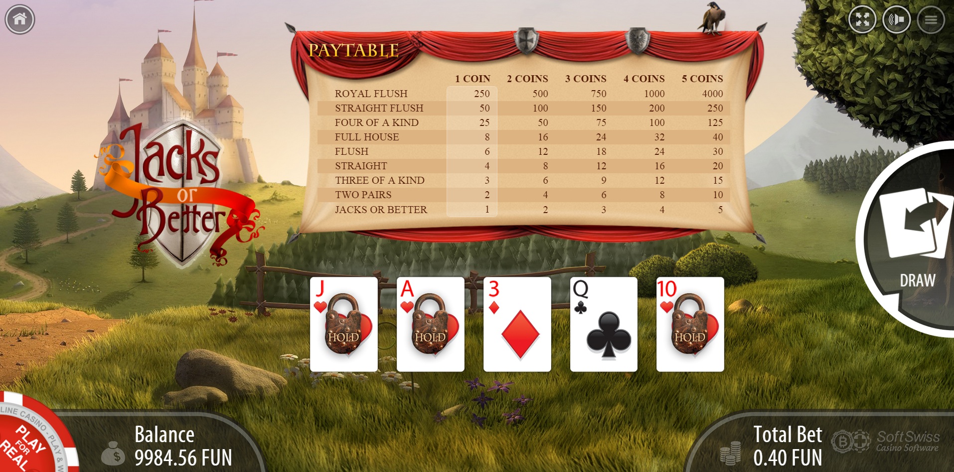 据我所知,BGaming 的唯一视频扑克游戏是 8-6 Jacks or Better,假设采用最佳策略,回报率为 98.39%。
