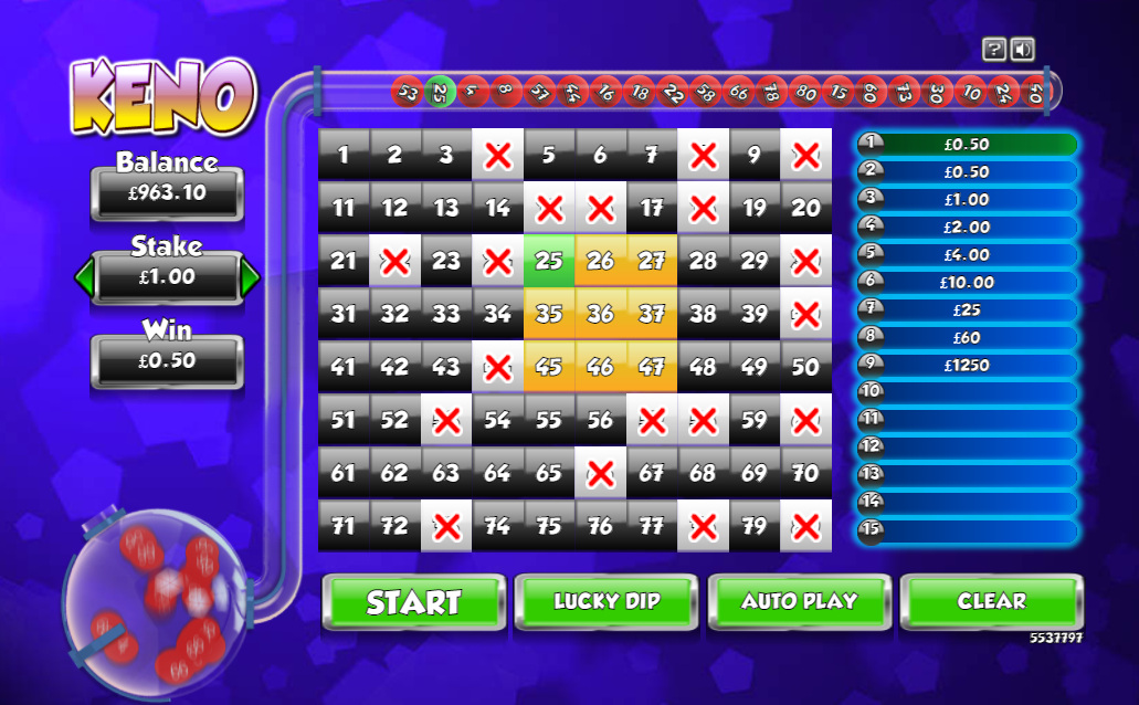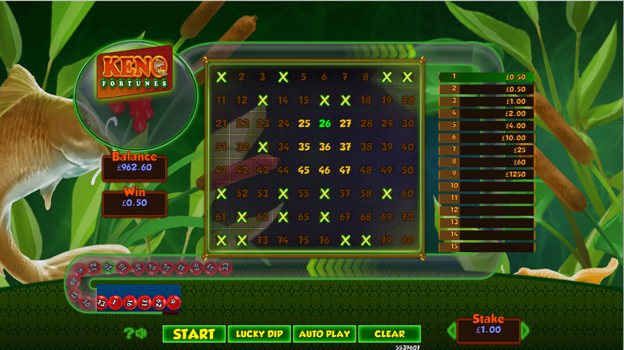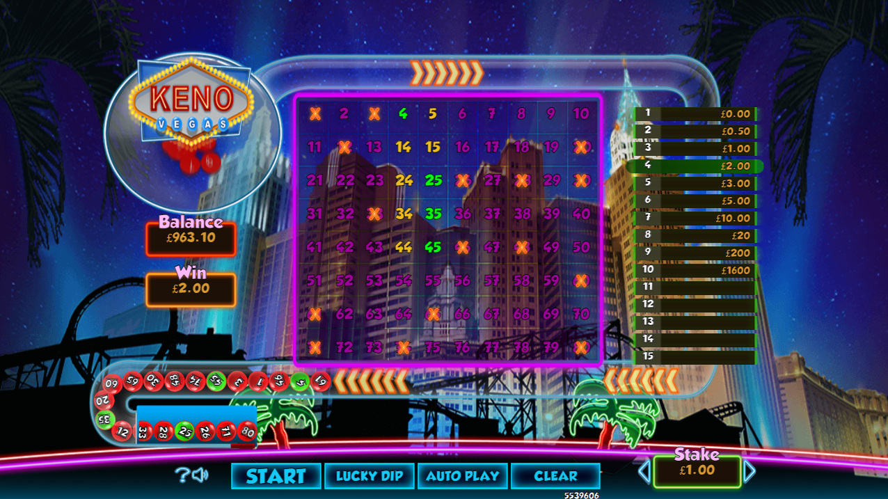 Concept 有三款基诺游戏,仅图形界面不同。赔率表和游戏玩法相同。玩家可以选择 1 到 15 个数字。回报率最低为 90%(选择 1),最高为 96.29%(选择 15)。以下是完整的赔率表。